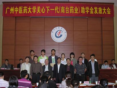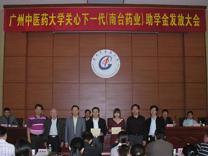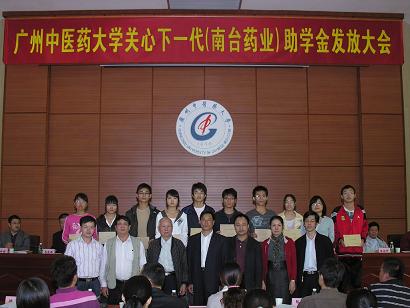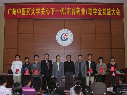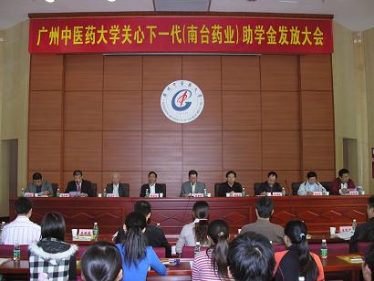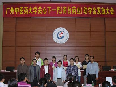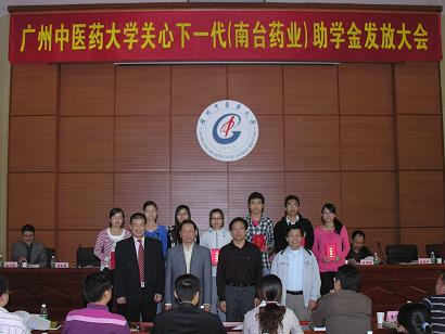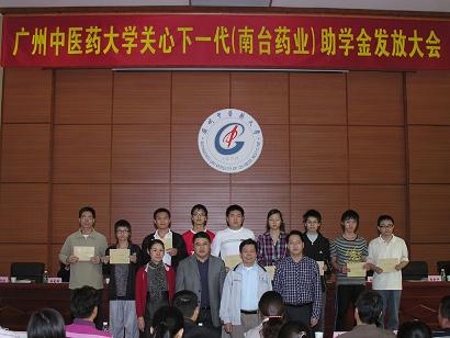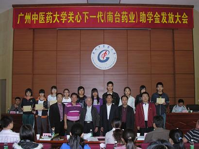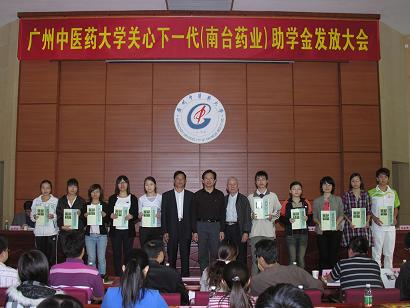 学校关工委办公室2010年11月29日报道:广中医关心下一代(南台药业)助学金颁发大会于11月25日下午在大学城校区办公楼2楼201学术报告厅隆重举行。广东南台药业有限公司董事长何润生、经理林伟强,学校关工委主任黄朝阳、副主任孙晓生,关工委扶贫帮困助学工作组组长徐鸿华,关工委秘书长张新仲、副秘书长温祥彬,原副秘书长、现任经济与管理学院党委书记郝宏伟等出席大会并在主席台就座。