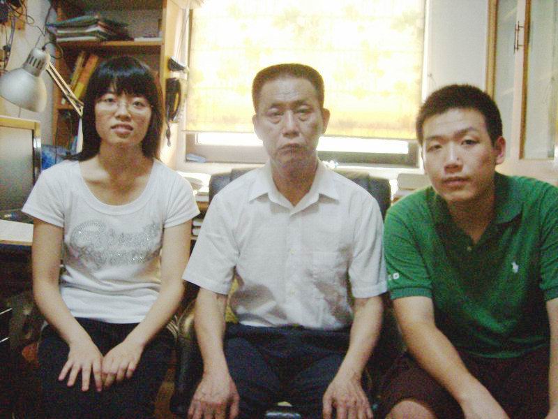 吴弥漫教授(中)与学生记者谢春莲(左)、何瑜(右)合影