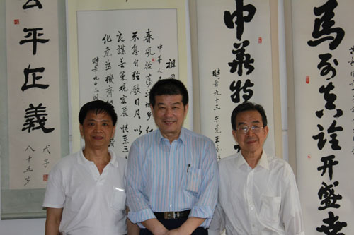 严国祥(左)捐款后与马定科(中)、肖鑫和(右)合影(张志英摄影)