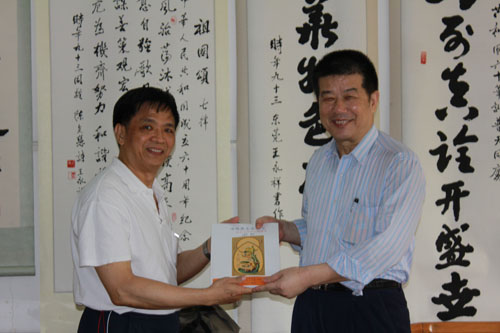 严国祥(左)向马定科(右)赠送《呼吸养生法讲义》(张志英摄影)