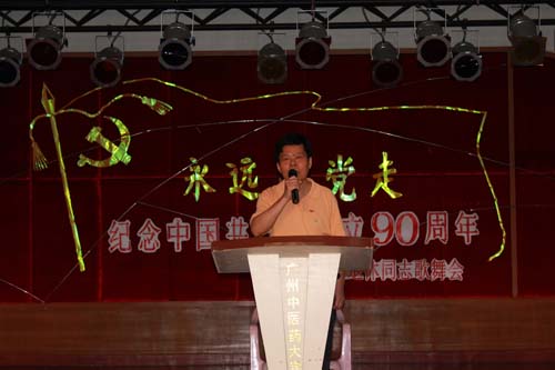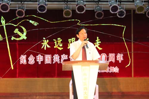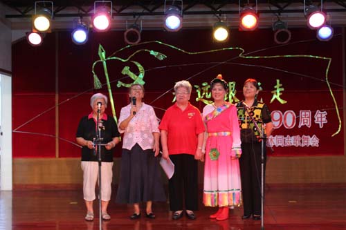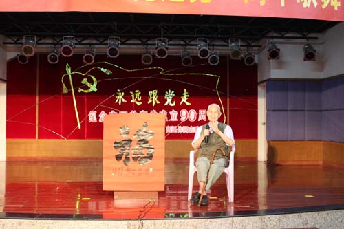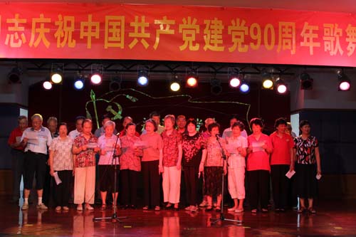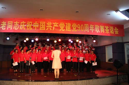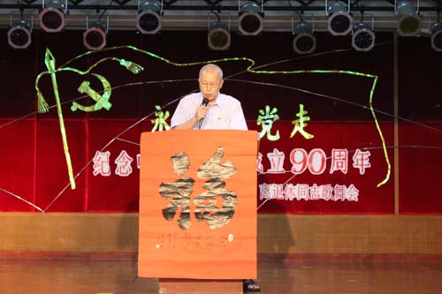 在学校党委副书记孙晓生致辞,与党风雨同舟75年的学校原党委书记、老红军王永祥发表感言,退休党总支书记梁广基发言以后,100多位老同志载歌载舞欢庆党的90寿诞。学校原党委书记王绵宁、原党委副书记何柏苍、原副院(校)长王裕怀等老领导分别参加所在党支部的合唱。全部年逾八十的10位离休干部带领全场高唱《没有共产党就没有新中国》之后,直属离休党支部书记孙天富抒发了“永远跟党走”的心声。