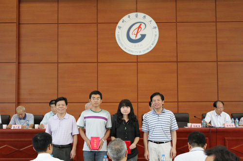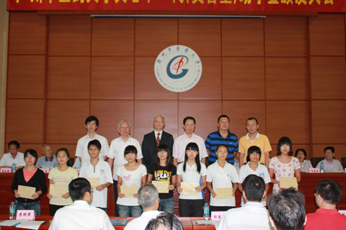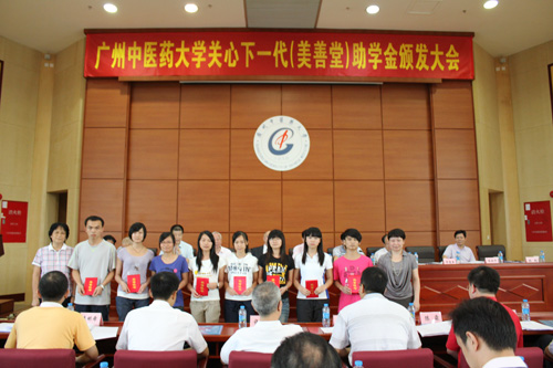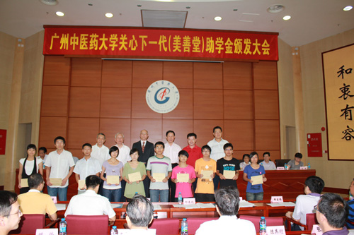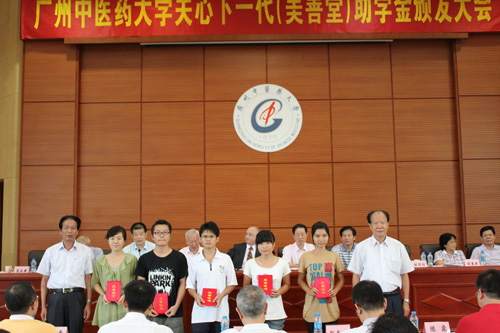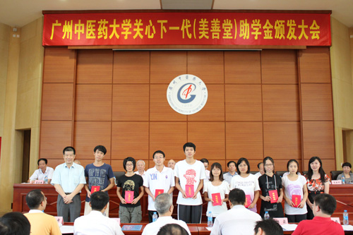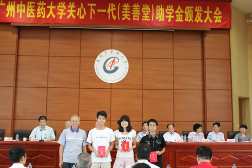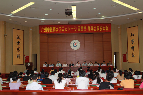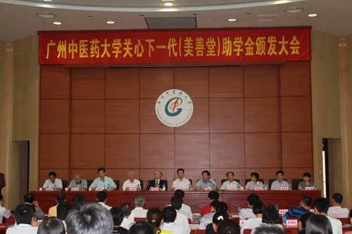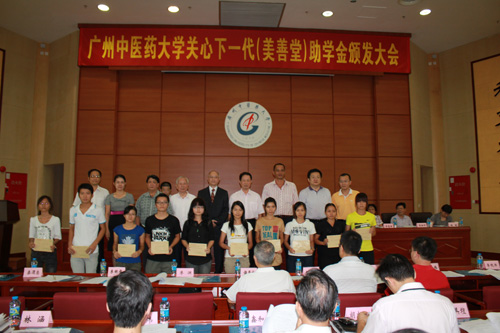 学校关工委办公室2011年9月21日报道:9月20日下午,学校关工委在大学城校区办公楼2楼201学术报告厅举行广中医关心下一代(美善堂)助学金颁发大会,美善堂生物科技(深圳)有限公司董事长吴善球先生,学校关工委主任、原党委书记黄朝阳,党委副书记、关工委副主任孙晓生,关工委副主任兼扶贫帮困助学工作组组长、德高望重的徐鸿华教授,关工委副主任杜同仿、符惠燕、梁广基,秘书长张新仲、常务副秘书长蓝森麟、副秘书长林彬等出席大会。