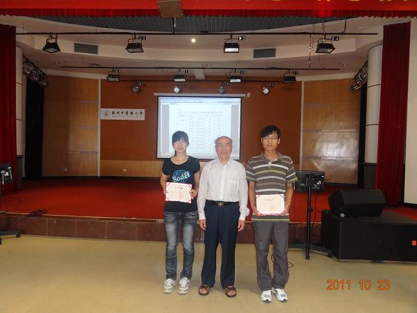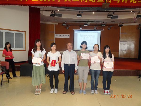 黄仰模(中)颁奖后与学校关工网站投稿刊稿先进学生一等奖获得者合影