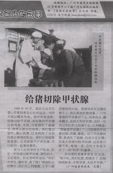 陈武光教授给学校关工办提供该文时附言:2011年10月17日,看到《广州文摘报》开辟“老照片的故事”新栏目,引起我的兴趣,马上按投稿邮箱,发稿《给猪切除甲状腺》(图/文)。10月31日,该报在“老照片的故事”栏目刊载本文,稿件这么快被刊载,实感意外。随后,该报编辑发来电邮说:“您投给我们的稿件无论是照片和故事都比较有意思,所以我们优先选用了您的投稿”。凝视照片,当年情景,浮现眼前,思绪万千,陷入沉思。科学,一旦被“政治”绑架,一旦受“狂热”蛊惑,一旦沦为“资本”奴婢,科学将走向何方?!现发送《给猪切除甲状腺》(图/文),呼唤善待动物,善待科学,善待人类。