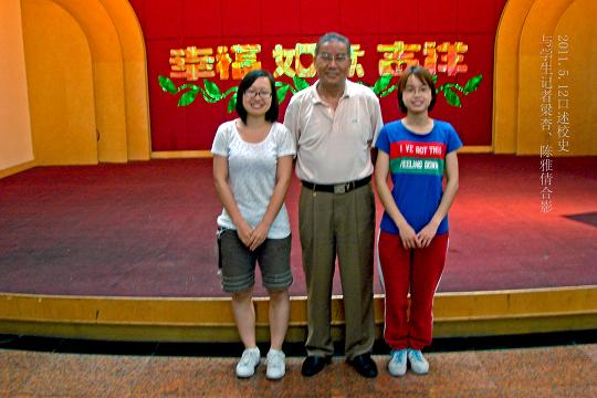 张俊荣教授(中)与学生记者梁杏(左)、陈雅倩(右)合影