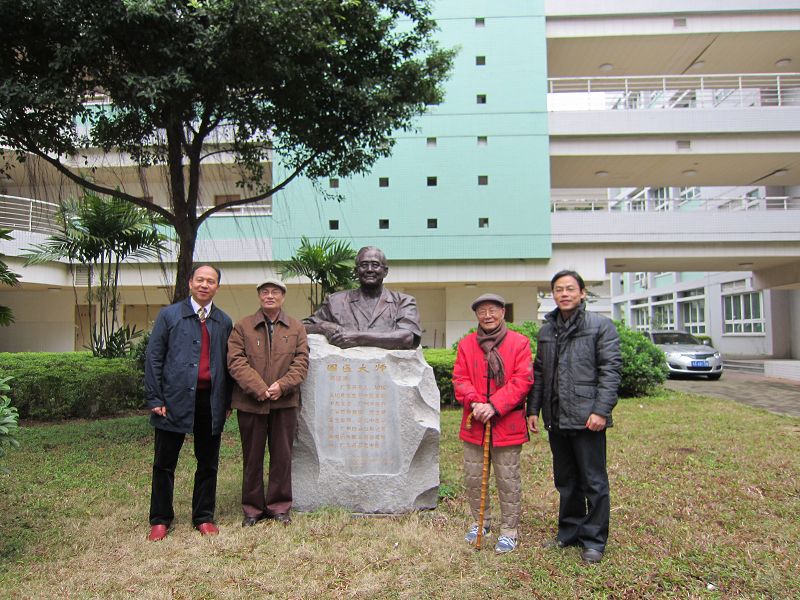 邓铁涛教授(右二)与随行人员在邓老铜像旁合影