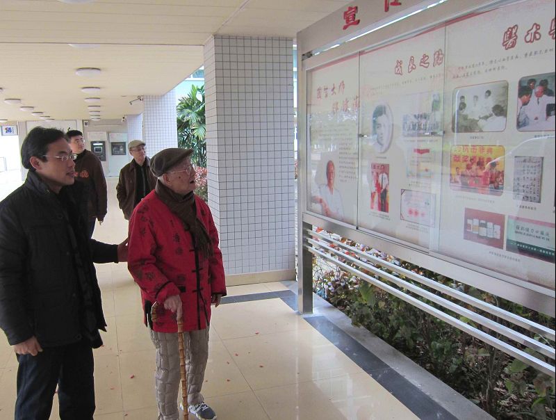 基础关工分委(陈炜)2012年2月22日报道:1月24日,正值大年初二,国医大师邓铁涛教授偕同家人来到大学城校区基础楼中庭花园察看邓老铜像安放情况,基础医学院院长郑洪、广东中医药博物馆馆长蓝韶清等随行。