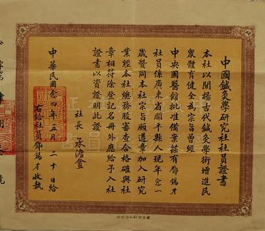 邓锡才(邓铁涛教授原名)的《中国针灸学研究社社员证书》