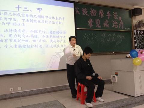 三院关工分委2012年3月8日报道:3月5日下午,三院关工分委常务副主任秦渭志教授在大学城校区综合楼102室,为该院学生作题为《浅谈按摩手法及常见病治疗》的专题讲座。
