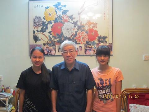 林超雄老师与学生记者吴惠英(左)、何丽珍(右)合影