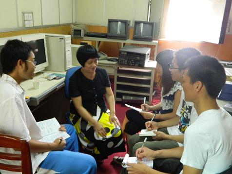 陈素院长(左二)在接受学生记者(自左至右)张祥全、欧韦妍、孙斌、李冬冬采访