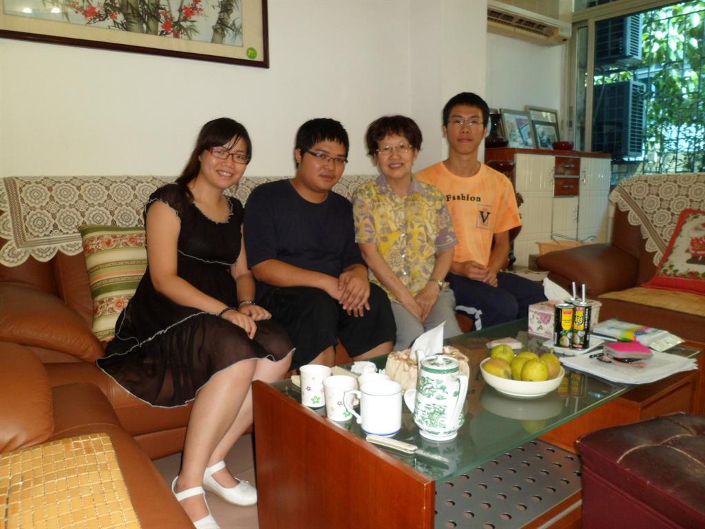 黎慰英主任(右二)与学生记者林丹、麦自强、邓海镖(自左至右)合影