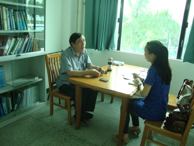 钟廷机副教授(左)在向学生记者讲述校史