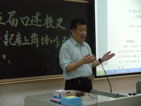 学生会新闻编辑部(黎嘉欣)2012年4月27日报道:4月25日下午,由我校团委、关工委、学生会主办,学生会新闻编辑部承办的第五届“口述校史”记者上岗培训班在大学城校区教室楼A209室举行。我校关工委常务副主任马定科教授担任了此次培训的主讲人,97名由各学院关工分委和我校学生会新闻编辑部筛选初步确定的学生记者参加了培训。