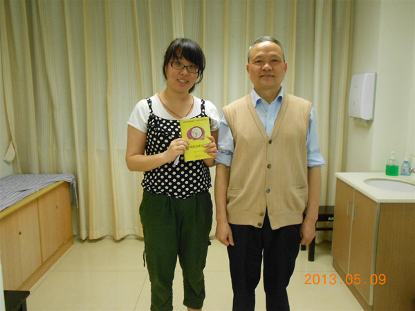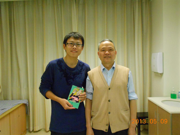 吴运泉老师(右)与手捧《中风防治与康复》的学生记者樊耀华(左)合影