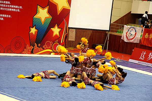 邱习勤老师提供的历史照片之二:邱习勤老师(后左一)与所带队伍获得全国啦啦队5级花球组冠军后合影