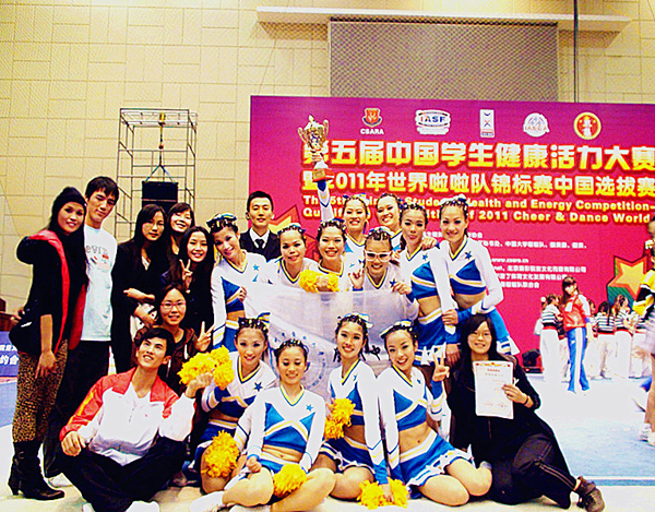 邱习勤老师提供的历史照片之三:邱习勤老师(左一)与所带队伍获得全国啦啦队5级花球组冠军后合影