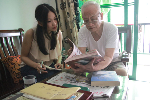 图5.马陈深教授自豪地介绍时任广东省委书记吴南生为答谢他而馈赠他的亲笔条幅(照片右上方)
