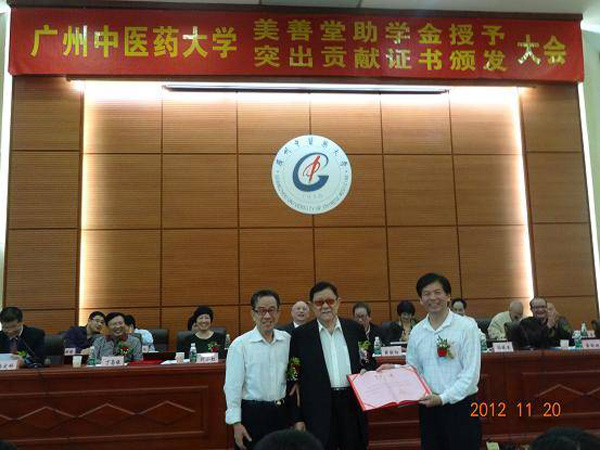 2012年11月20日,黄朝阳(右)向累计捐款86万元的美善堂董事长