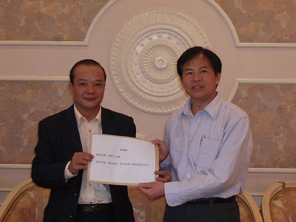 2012年11月20日,孙晓生(右)向累计捐款6万元的社会人士辜学海先生(中)颁发突出贡献证书,左为这项捐款的学校联系人肖鑫和教授