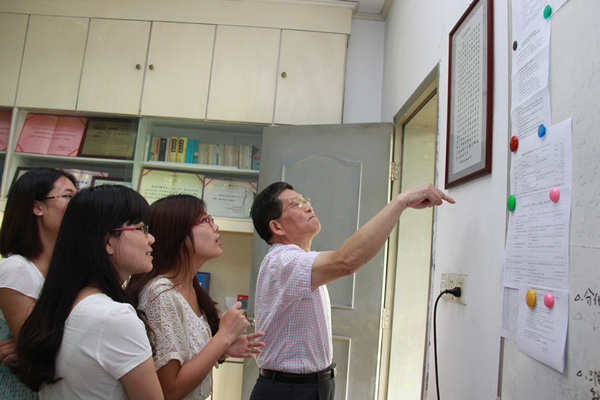 图6.林培政教授引导学生记者读刘仕昌教授书写的《医家座右铭》