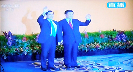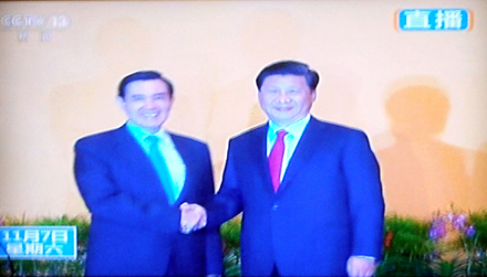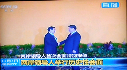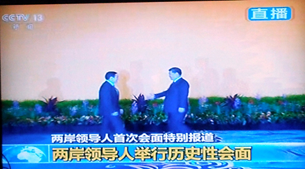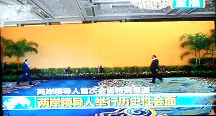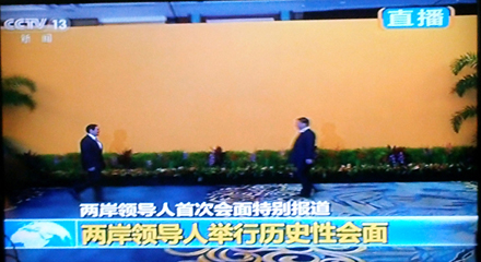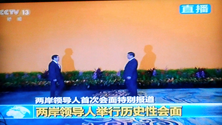 陈武光教授在电视直播中截取了8个珍贵画面,配文写道:2015年11月7日,14时59分,新加坡香格里拉大酒店,两岸领导人,习近平与马英九,缓步走来,伸手相握。历史一瞬,世纪之握,一分十秒,挥手十秒钟。