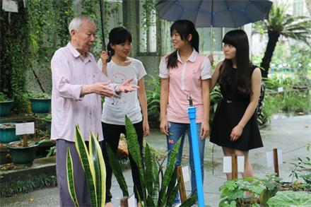 徐老放弃午休时间带领学生记者参观三元里校区药圃,边走边讲述