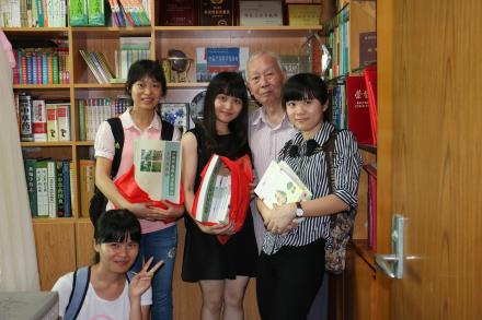 徐老(左三)偕夫人(右三)与学生记者(自左至右林淑玲、邹晓婷、宋小梅、王笑)合影