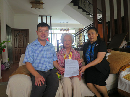 我校符合“四个条件”的抗日老战士、老同志共有8位:王永祥、何秀英(女)、吴耀培、姬英(女)、李伟芳(女)、杨复、董宝玉(女)、毛海云(女);年龄最大的97岁,最小的88岁;参加革命工作的时间从1936年到1945年不等。李伟芳因病入住深圳市人民医院,潘华峰等前往医院探望,祝她早日康复。何秀英符合享受副省级医疗待遇的条件,潘华峰向她传达了相关文件精神并转交了复印件以备留存。毛海云已于今年3月病逝,潘华峰将纪念章和慰问金交到了她的家属手中。