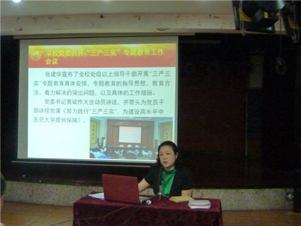 在谈到离退休处相关工作时,潘华峰首先以“再造‘品牌’”为题充分肯定了学校关心下一代工作:继续擦亮了“关工品牌”——关工网站、助学基金、口述校史、青蓝工程、科普教育、学生党建;刚刚结束的全省高校践行社会主义核心价值观座谈会,有51所学校81名代表参加,7所学校关工委代表作大会发言,我校关工委代表是其中之一,第二个登台介绍经验。然后,她分4点进行讲述:第一,老有所为,关工委为学校学生党建工作作出了成绩;第二,积极捐款,上半年再增助学基金6万多元;第三,精品网站,我校关工网站吸引了众多读者,访问量已经突破155万人次,日均约1500人次,得到全国同行一致好评;第四,口述校史,关工委组织的口述校史已经经历7届,共有165位老领导、老专家、老校友接受434名学生记者的分组采访。