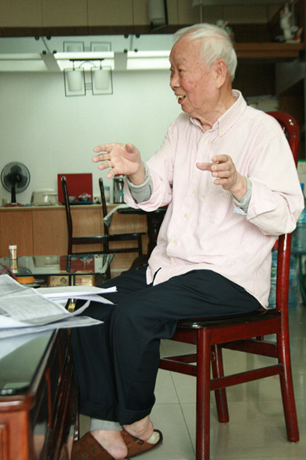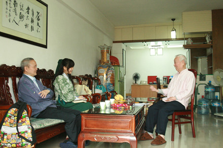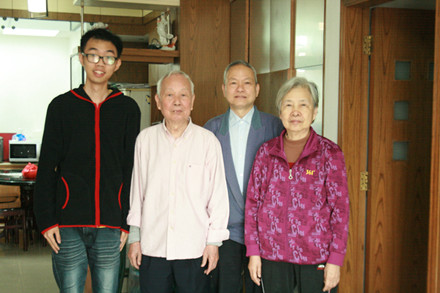 徐鸿华教授(左二)与学生记者赖成俊(左一)合影(右二是吴运泉教授,右一是林诗书教授)