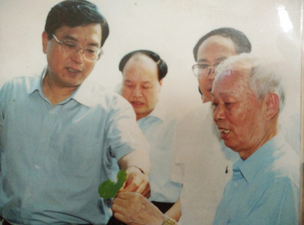 徐鸿华教授(右一)向时任广东省委书记张德江(左一)介绍中草药种植基地建设情况(翻拍)