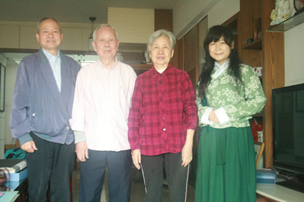 徐鸿华教授(左二)与学生记者何欢(右一)合影(左一是吴运泉教授,右二是林诗书教授)