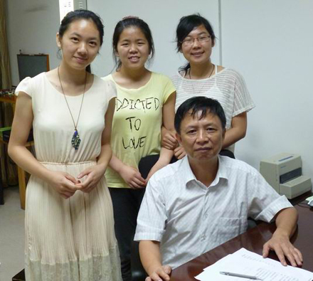 彭耀崧老师(前)与学生记者(从左到右)黎巧贤、田淑萍、戚罗燕合影