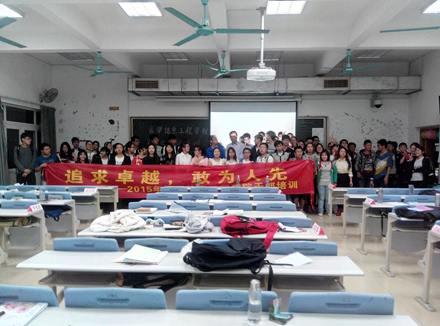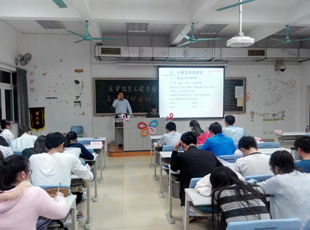 医工关工分委2015年4月17日报道:4月14日晚7时,医学信息工程学院2015年团学干部素质提升培训班开班仪式在大学城校区教室楼A301室举行,学校关工委常务副主任马定科研究员应邀出席并为这个培训班讲授第一课,医工学院党委副书记方振聪,学工办主任胡志波,兼职辅导员李攀、吴伟江、王慧丽,以及参加培训的团学干部近百人到场。
