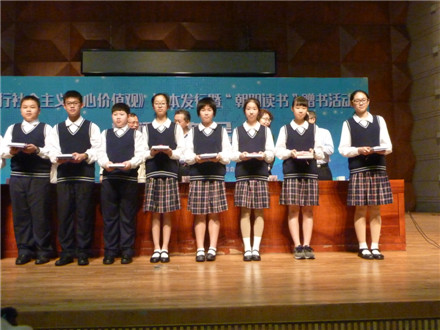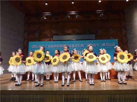 会上,与会领导向小学生、中学生、大学生代表赠书,一群小学生演唱了《社会主义核心价值观二十四字歌》。