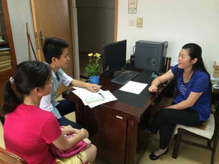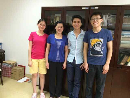 何丽春老师(左二)与学生记者(从左到右)陈思、郑文江、樊耀华合影