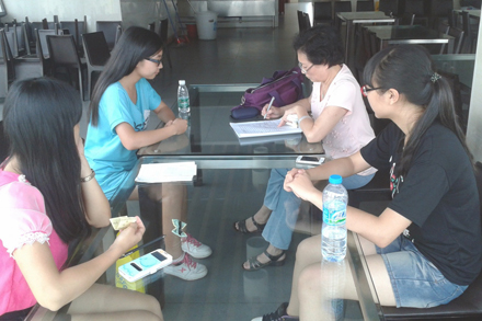 梁青萍老师(中)与学生记者(自左至右)杨海梅、谢嘉丽、张妙娜、黄小靖合影