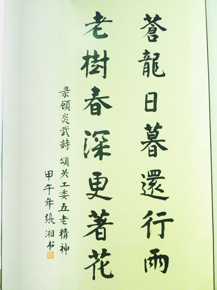 想起顾炎武“苍龙日暮还行雨,老树春深更著花”两句诗句,觉得与当今关工委五老精神有异曲同工之妙,特录之并裱成条幅,赠送学校关工委。