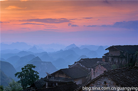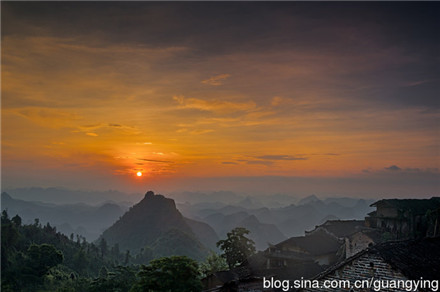 油岭晨曦,群山仍在朦胧中,那朝霞染红天边,唤醒了树林、瑶寨