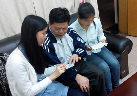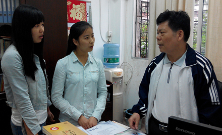张新仲老师(中)在审阅记者的笔录