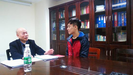 黄仰模教授(左)与郑旭威同学谈话