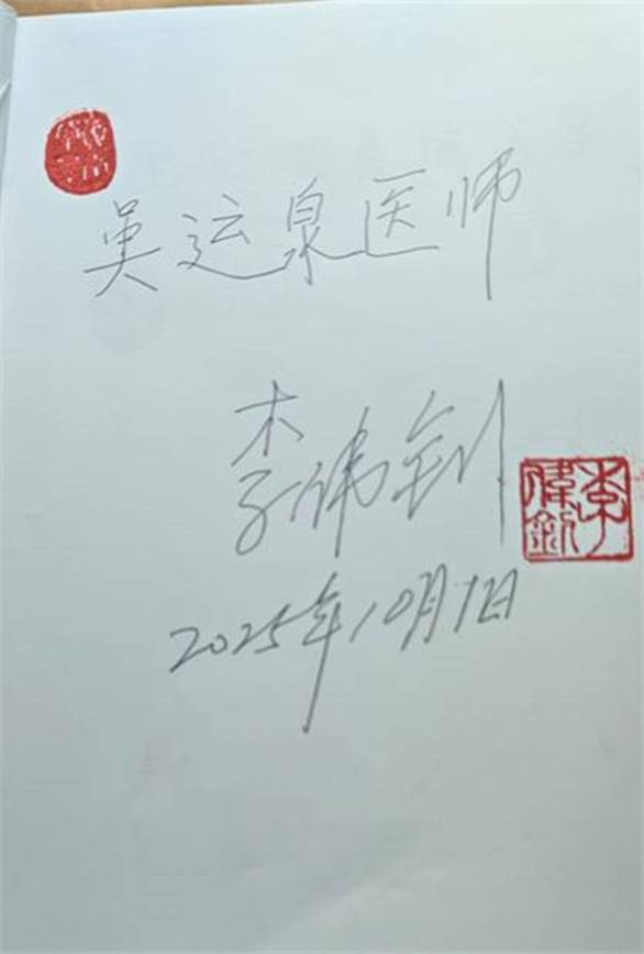 吴运泉教授开头撰文赋诗道:今天(2025年10月1日),是国庆节,我随书法家萧远荣,到广州市荔湾区恩宁路昌华大街,登门拜访盆景大王李伟钊。李老师和夫人黄詠娥热情招待我们。今日议程有三:一是参观盆景:我们一起到永庆坊粤剧艺术博物馆门前,参观学习李老师栽培的大型盆景(例如铁骨铮铮等);二是赠书活动:李老师向笔者赠送《微型树根雀梅盆景》(李伟钊工作室李伟钊、陈国强、莫伟、方丹心编著,科学文化出版社出版 2024年9月第1版),在萧老师协助下,完成签名盖章全过程;三是共进午餐:中午在李老师工作室一楼客厅共进午餐。有其关门弟子梁凤仪(昵称白雪公主)作陪。