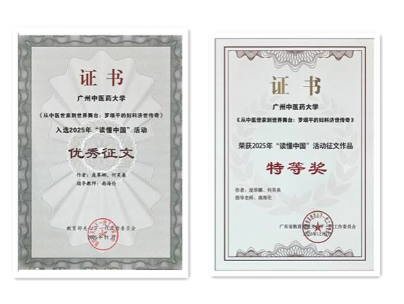 2026年4月17日,学校关工网站“理论园地”之“口述历史”栏目“读懂中国”系列刊发,由一院南海伦作为指导教师,学生作者庞翠娜和何昊燊撰写的文章《从中医世家到世界舞台:罗颂平的妇科济世传奇》,这篇文章荣获2025年“读懂中国”活动教育部关工委“优秀征文”、广东省教育系统关工委征文特等奖。